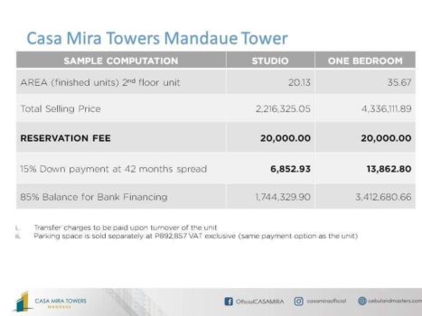 Casa Mira Mandaue is a new condominium located just a few steps from Pacific Mall, Mandaue, St. Louise School, Maayo Hotel and a few minutes drive to the Mactan Cebu Airport. This is an ideal location that gives opportunity to starting families and single professionals to acquire a practical livable abode that is affordable within the heart of Mandaue City.